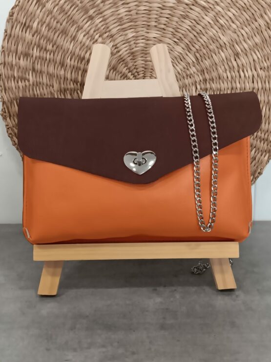 Cuir lisse orange pour le devant et cuir marron pour le dos et le rabat.